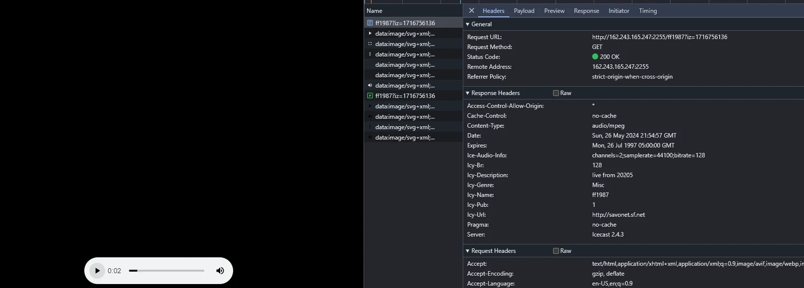 The Jaaky channel ( https://www.youtube.com/@jaaky2255 ) I found https://pynk5.com/404 . Which lead me to https://pynk5.com/3121534312 and https://pynk5.com/1717033927 . I found the audio source http://162.243.165.247:2255/ff1987?iz=1716752987 which seems to link to a web radio of some kind. http://savonet.sf.net redirects to https://www.liquidsoap.info/ .